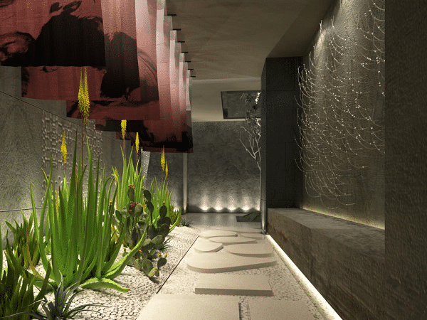 環境藝術設計通過一定的組織、圍合手段、對空間界面(室內外墻柱面、地面、頂棚、門窗等)進行藝術處理(形態、色彩、質地等),運用自然光、人工照明、家具、飾物的布置、造型等設計語言,以及植物花卉、水體、小品、雕塑等的配置,使建筑物的室內外空間環境體現出特定的氛圍和一定的風格,來滿足人們的功能使用及視覺審美上的需要。